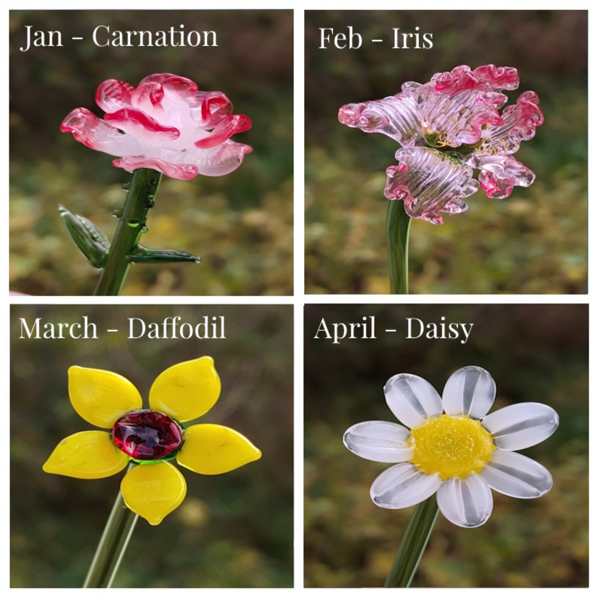 Birth Flowers - Miniature glass flowers are handmade with care, individually shaped to capture the unique charm of its month—from January’s sweet Carnation to December’s delicate Narcissus.